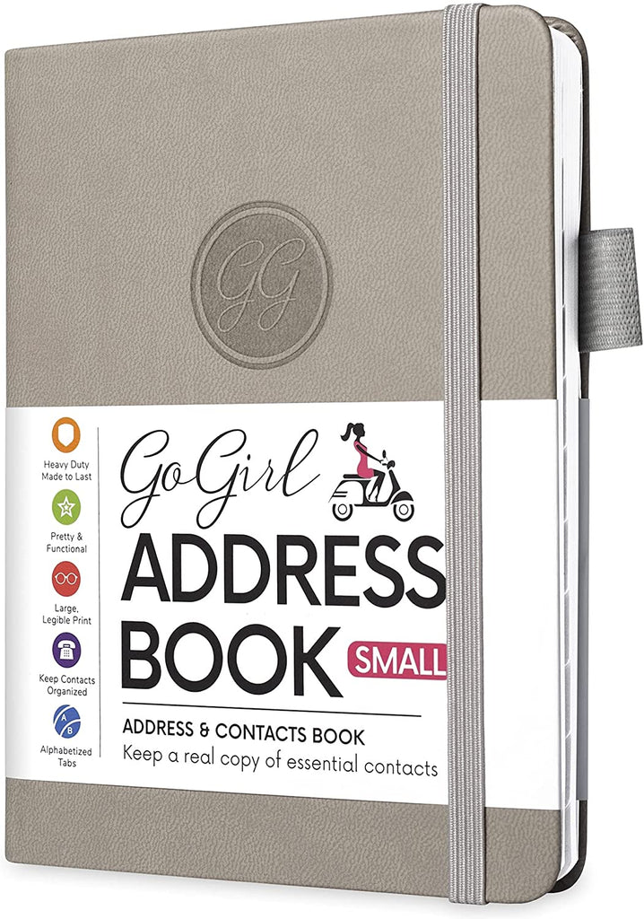 GoGirl Address Book – Telephone and Address Book with Alphabetic Tabs for Safely Storing Contacts, Small-Sized (4.0″ x 5.5″) PU Leather Grey Hardcover